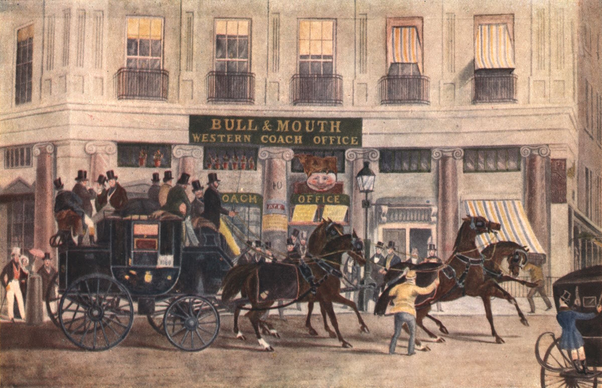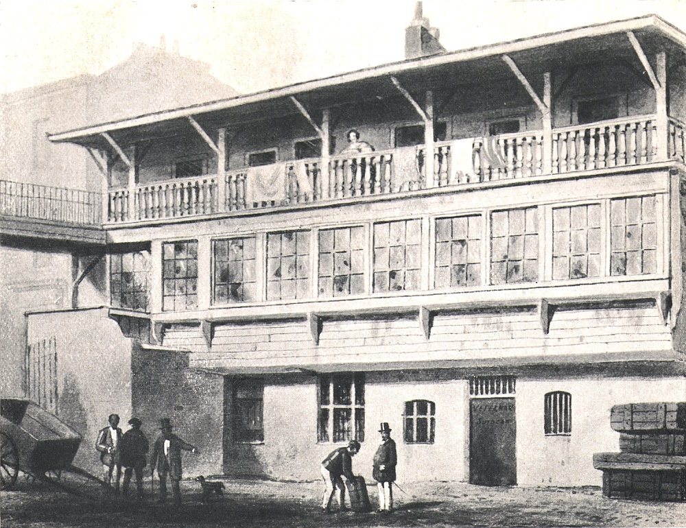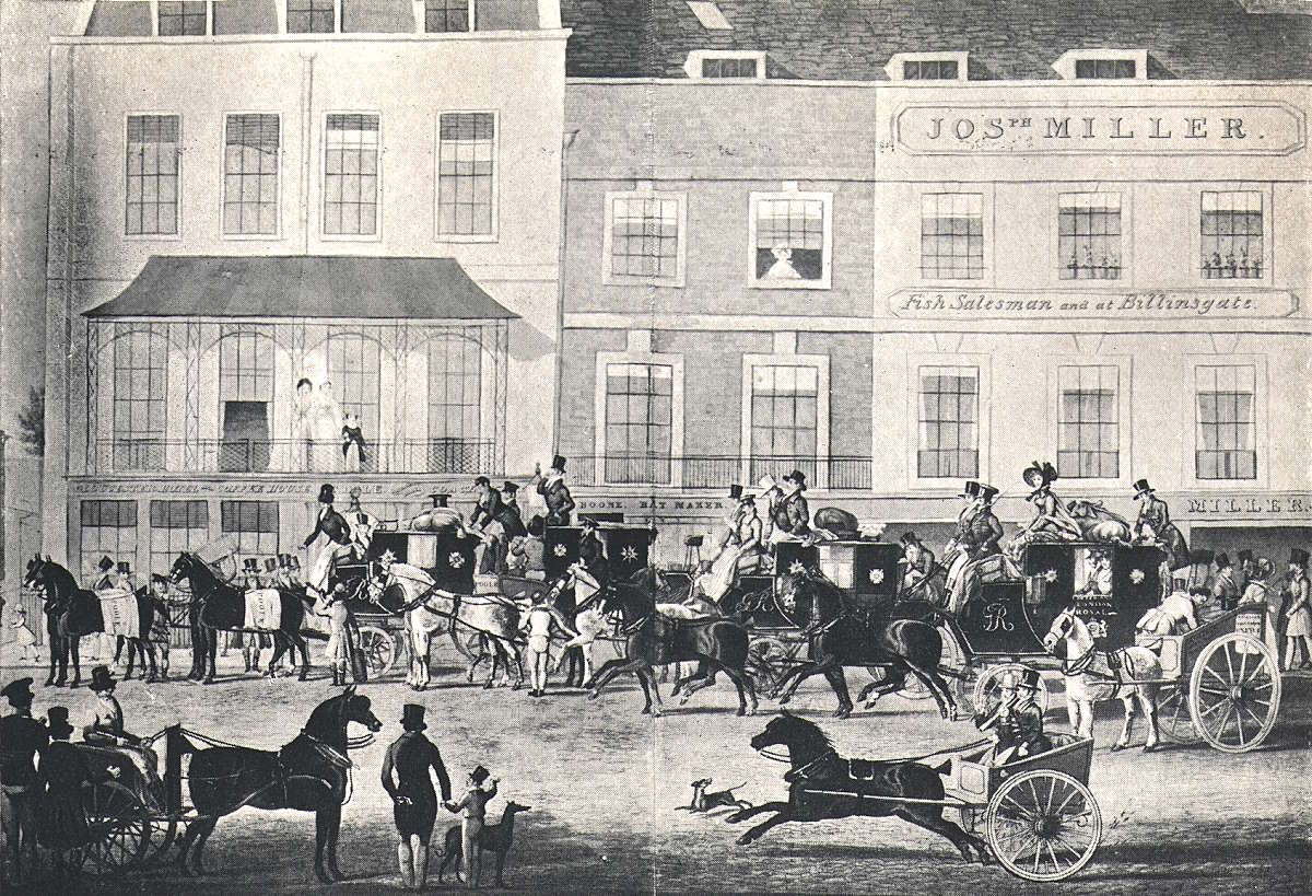 | *THE WHITE HORSE CELLAR (HATCHETT’S RESTAURANT), PICCADILLY (From a Drawing by George Cruickshank.) |