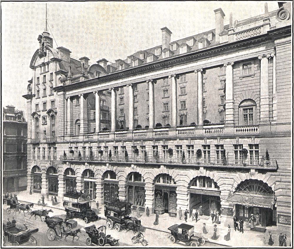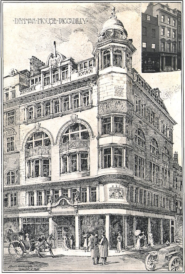 [3] As an example of the rebuilding of Piccadilly, so rapidly going on during the last few years, a drawing of one of its handsomest structures, Denman House, at the corner of Air Street, is given. Built in 1903, it replaces the old building, where the late Mr. James L. Denman had been established for over half a century. Messrs. Denman & Co., having acquired the freeholds of the vineyards of the celebrated “J. Lemoine,” Champagne, and also the “Chateau Livran” estate with its 350 acres of vines in the Medoc, required larger premises. Denman House was therefore built, from the designs of Mr. Harold A. Woodington, A.R.I.B.A. The upper part of the old building, which appears in the vignette, was leased in the early fifties to the Marquis Townshend for the Pall Mall Club.—(Publishers’ Note).