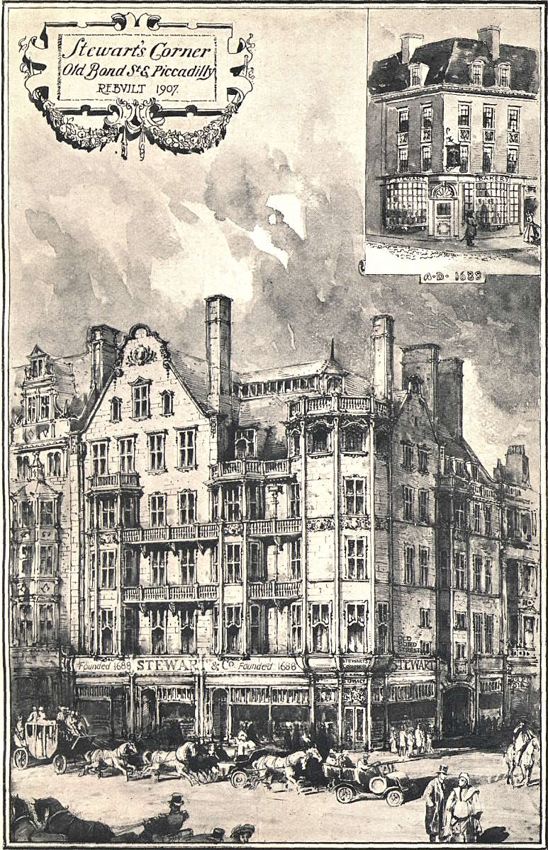 To begin one’s peregrinations at the corner of Bond Street and Piccadilly seems at first sight a little arbitrary, but one soon realises that in starting from “Stewart’s,” and keeping within a half-mile radius of this centre, one is really covering by far the most interesting portion of the West End; while the old shop, which—during more than two centuries—has given its name to this corner of Bond Street, and which, as Mr. Chancellor declares, is to Americans one of the best known spots in Europe, is in itself a most interesting link with the past and present.