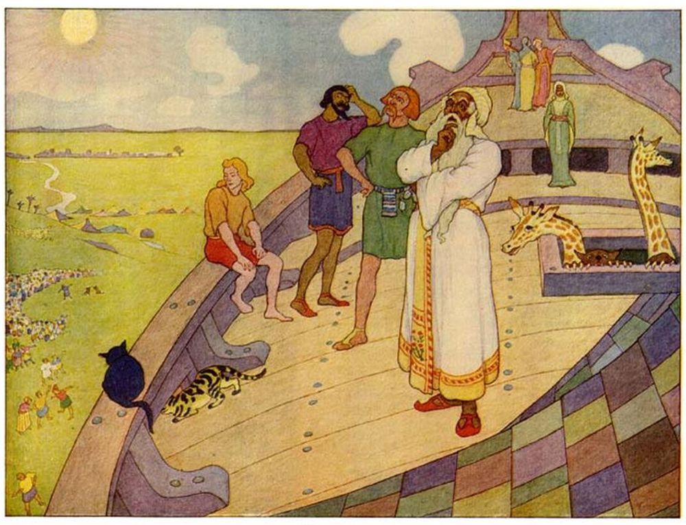 Now Noah was warned that a great flood was to come, which would pour down from the clouds and drown the whole earth. He straightway told his neighbors what was to happen, but they refused to believe, and scoffed at him, and said: “Let it rain.[2]”