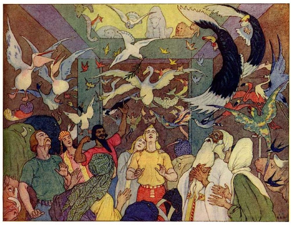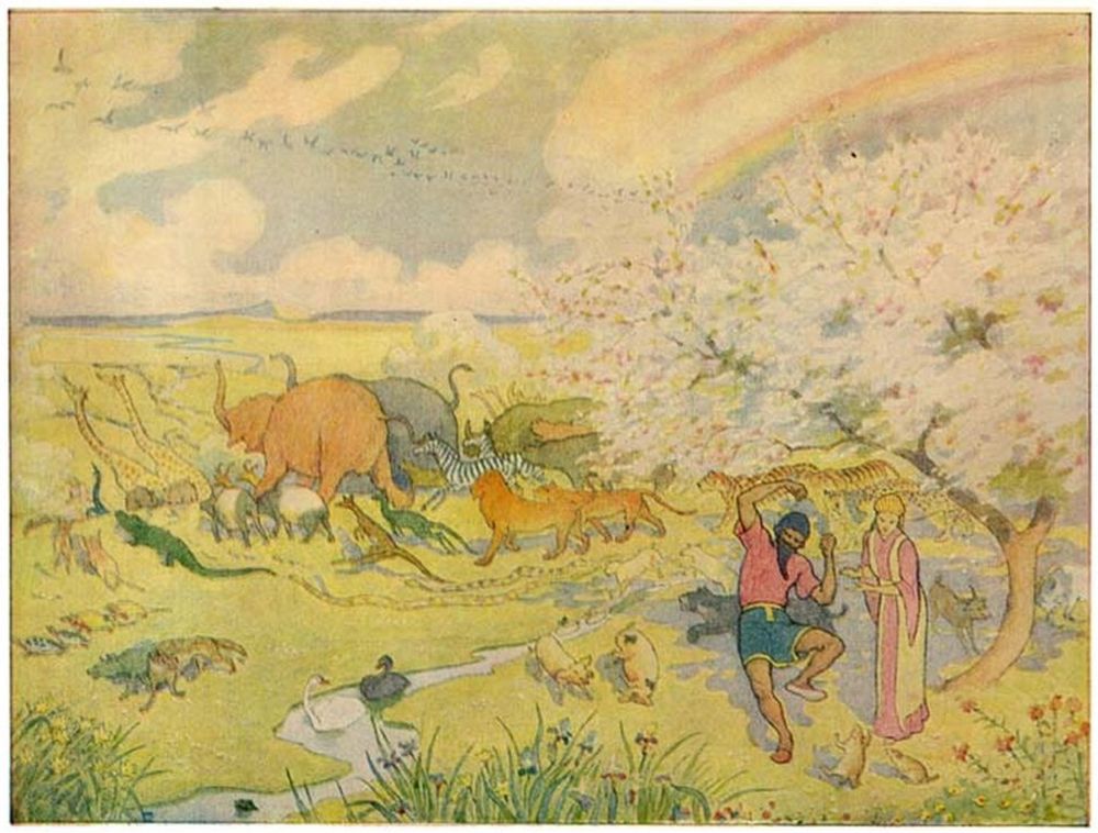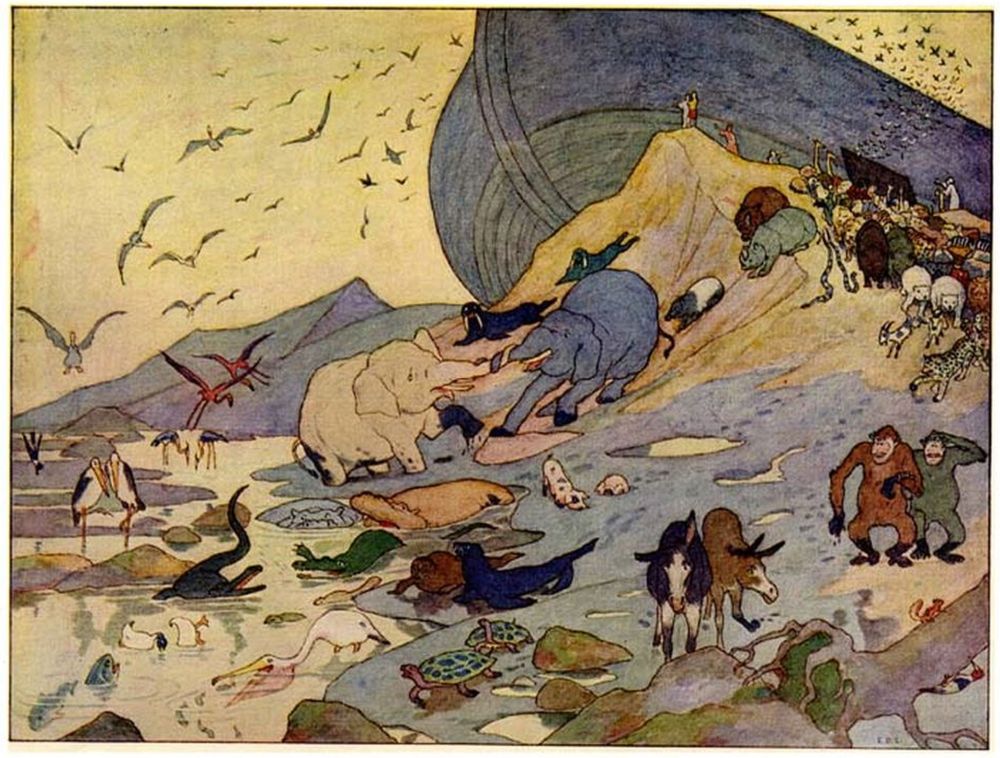 And Noah bade the beasts and birds go forth and seek new homes. And they scattered in every direction to begin life afresh; while Noah’s wife murmured “good riddance,” and vowed that she would never go to sea again.
