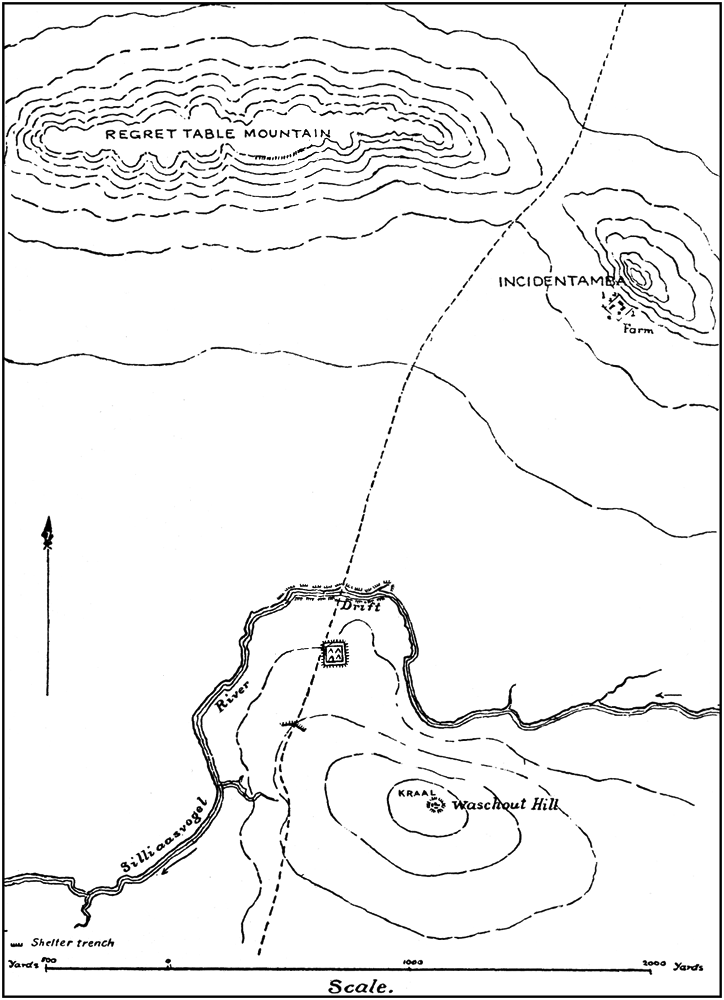 After sending out the patrols, and placing a guard on Waschout Hill, as already described, and whilst the stores were being collected, I considered deeply what position I should take up, and walked up to the top of Waschout Hill to spy out the land. On the top I found a Kaffir kraal, [174]which I saw would assist me much to concealment should I decide to hold this hill. This I was very inclined to do, but after a few minutes' trial of the shape of the ground, with the help of some men walking about down below, and my eyes a little above ground-level—I found that its convexity was such that, to see and fire on the drift and the approach on the south side, I should have to abandon the top of the hill, and so the friendly concealment of the Kaffir huts, and take up a position on the open hillside some way down. This was, of course, quite feasible, especially if I held a position at the top of the hill as well, near the huts on the east and southeast sides; but, as it would be impossible to really conceal ourselves on the bare hillside, it meant giving up all idea of surprising the enemy, which I wished to do. I must, therefore, find some other place which would lend itself to easy and good concealment, and also have the drift or its approaches under close rifle-fire. But where to find such a place?