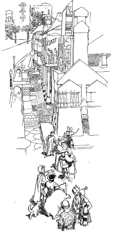 Quite soon they found themselves in the central square of one of the most beautiful towns in the world. I wish I had time to tell you exactly what it was like, but I have not. I can only say that it was at once clean and grand, splendid and comfortable. There was not a dirty corner nor a sad face from one end of the town to the other. The houses were made of great blocks of stone inlaid wonderfully with gold and silver; clear streams—or baby canals—ran by the side of every street, and each street had a double row of trees running all along its wide length. There were open, grassy spaces and flower-beds set with flowers, some glowing with their natural and lovely colours and some cunningly fashioned of gold and silver and jewels. There were fountains and miniature waterfalls. The faces of the people were dark, but kind and unwrinkled. There was a market with stalls of pleasant fruits and cakes and bright-coloured, soft clothes. There was a great Hall in the middle of the town with a garden on its flat roof, and to this Hall the shepherd led the party.