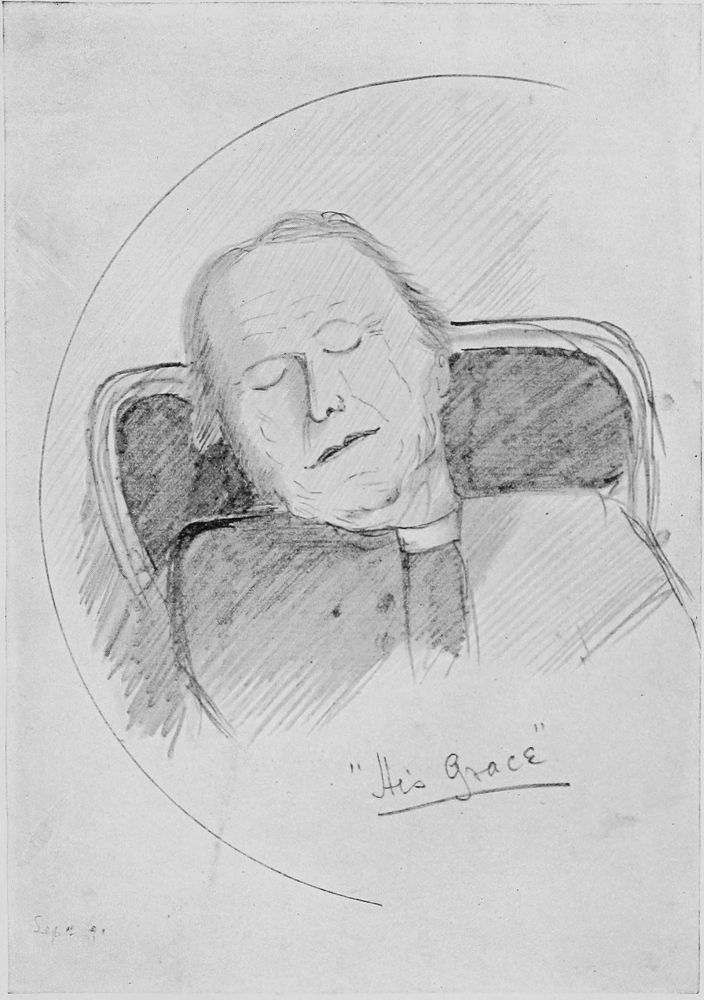 After prayers were over, while breakfast was being brought up, it was my task to go round the walls of the dining-room, where hung engravings of eminent personages, and name them. There was the Prince Consort in striped trousers with a bowler hat in his hand, the Duke of Wellington in knee-breeches, the head and shoulders of Dr. Walford, a full length of Dean Stanley, and Dr.{24} Martin Routh in a wig reading a book. Round the edge of this which I think must have been a mezzotint were various small sketches of the said Dr. Martin Routh in other attitudes. Then came the smell of sausages and the advent of two or three sixth form boys who in turn breakfasted with my father. These were very glorious persons and I marvelled at their condescension in coming. Once the head of the school came, and following my father’s example I addressed him by his surname (whatever it was) without the prefix of “Mister,” for which omission I was corrected. But out of his magnificence he did not seem to mind.