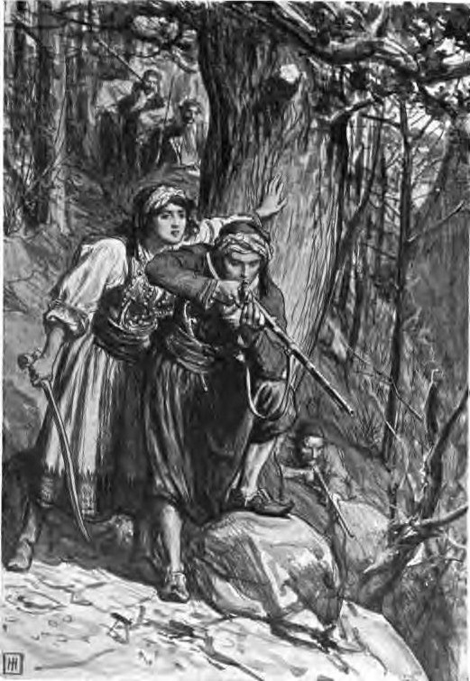 By this time the men had turned out under arms; and Mitsos gave the order to stand ready. The words were hardly spoken when some sixty Turkish cavalry appeared suddenly in sight over the brow of the hill. Now on such broken and uneven ground cavalry were by far less formidable than on the level, and Mitsos rapidly gave the order.