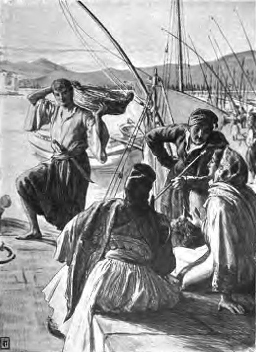 That day, being so close to their journey's end, they had no midday halt, but pushed on, and reached the town about three. The men at once began throwing up a camp on the promontory to the west of the harbor, outside the town, and close to the building custom-house. On the march they had cut numbers of poles and beams from the pine-trees, which would form the skeletons of their huts, and over these they would make thatching with pine-branches, canvas, or whatever came handy. The Capsina found lodging with her cousin, the Mayor Elias. Mitsos went with the men.