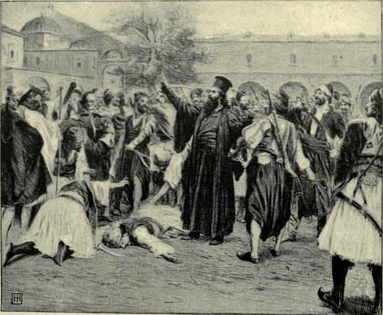 That afternoon there was a division of the spoils taken, and in the evening, but not before a terrible and bloody deed had been done, three corps went back to their homes, the Mainats alone remaining. The Argives and Mainats, at any rate, had no hand in that devilish work, which must be passed over quickly. All the Turks—men, women, and children—who were found still alive were driven to the ravine behind Trikorpha, and some two thousand in number were all murdered.