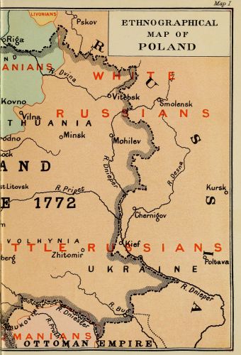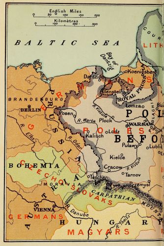 Briefly then the historical grounds on which these claims rest are as follows; they are matters of fact, not of theory or political expediency, and as far as they go are indisputable. Up to the year 1772 when the first partition of Poland occurred it was a state of great extent with a sea-board on the Baltic, and a united realm, embracing not only what is now known as the Kingdom of Poland in Russia, but stretching eastwards as far as the Dnieper, and including the north-west and south-west provinces of Russia, i.e., the governments of Kovno, Vilna, Grodno, Minsk, Mohileff, Vitebsk, Volhynia, Podolia, Kieff.[3] In Austria-Hungary it included Galicia and originally Austrian Silesia (Teschen); in Germany, so-called Royal Prussia (West Prussia and Ermland) and Posen. The whole course of the Vistula lay within its frontiers from its rise in the Carpathians to its debouchment at Dantzig, which was a Polish port. East Prussia also had been originally a fief of Poland, and the Hohenzollerns of Brandenburg vassals of its king. Early in the 17th century, however (1611), when Sigismund III was on the Polish throne, East Prussia ceased to pay its{37} tribute-money and Poland was in too weak a state to enforce it. From that date therefore, until the partitions Eastern Prussia was an island, so to speak, in Poland, severed by the Polish territory on the Vistula from Brandenburg.