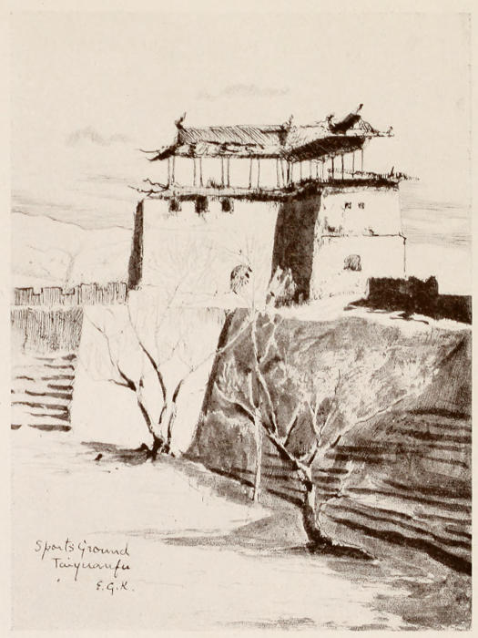 The next afternoon we reached Tientsin at 4.40, and had to change into a crowded train to Peking; there is always, I believe, a sort of free fight to get in at all, and the weakest go to the wall, except in the case of children, for the Chinese are very fond of children, and never fail to make room for them. Peking is reached by 8 p.m. After leaving the train we passed through two great old gateways, linking Past and Present, to another railway station close at hand, and had only sufficient time to get our luggage through the customs, and to start at 9.30 on the Peking-Hankow line for the junction at Shihchiah Chwang. It is not pleasant to do cross-country travelling in any country at night, and to reach a place at 4.20 a.m. on a cold February morning where you have to change stations would be far too difficult a matter for foreigners were it not for mission friends. They never seem to think anything of such trifles as spending nights looking after helpless travellers. We soon got all our goods and chattels out, and handed them over to a Chinese, whom our friend had engaged to look after them till the train left at 7 a.m. for Taiyuanfu. Meanwhile he escorted us to a clean inn, and comforted us with tea and cake and bedding till it was time to start. The bright cold dawn saw us off once more at 6 o’clock, rather enjoying a walk to the station; there we got into quite a comfortable train, and our friend travelled with us back to his own station, the first up the line. All day we passed through fascinating scenery, often following the course of a river, where turbine water-wheels in groups were busy grinding corn.