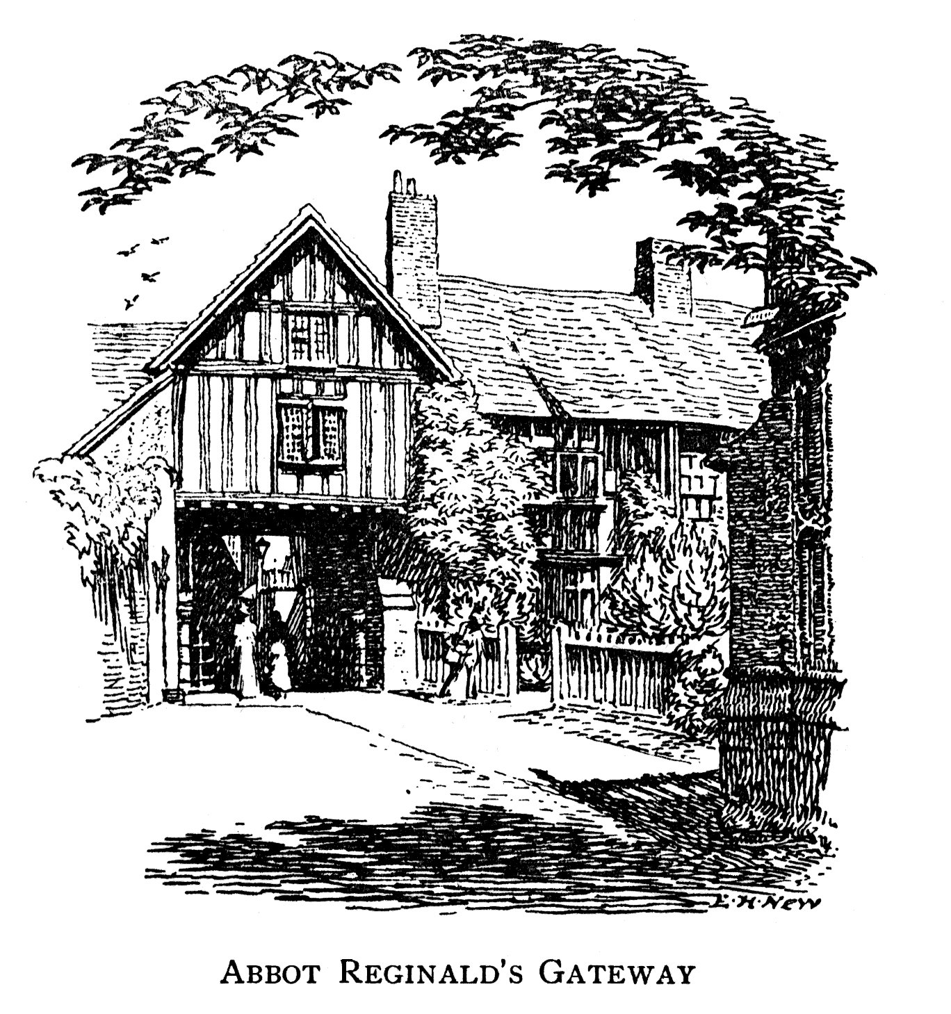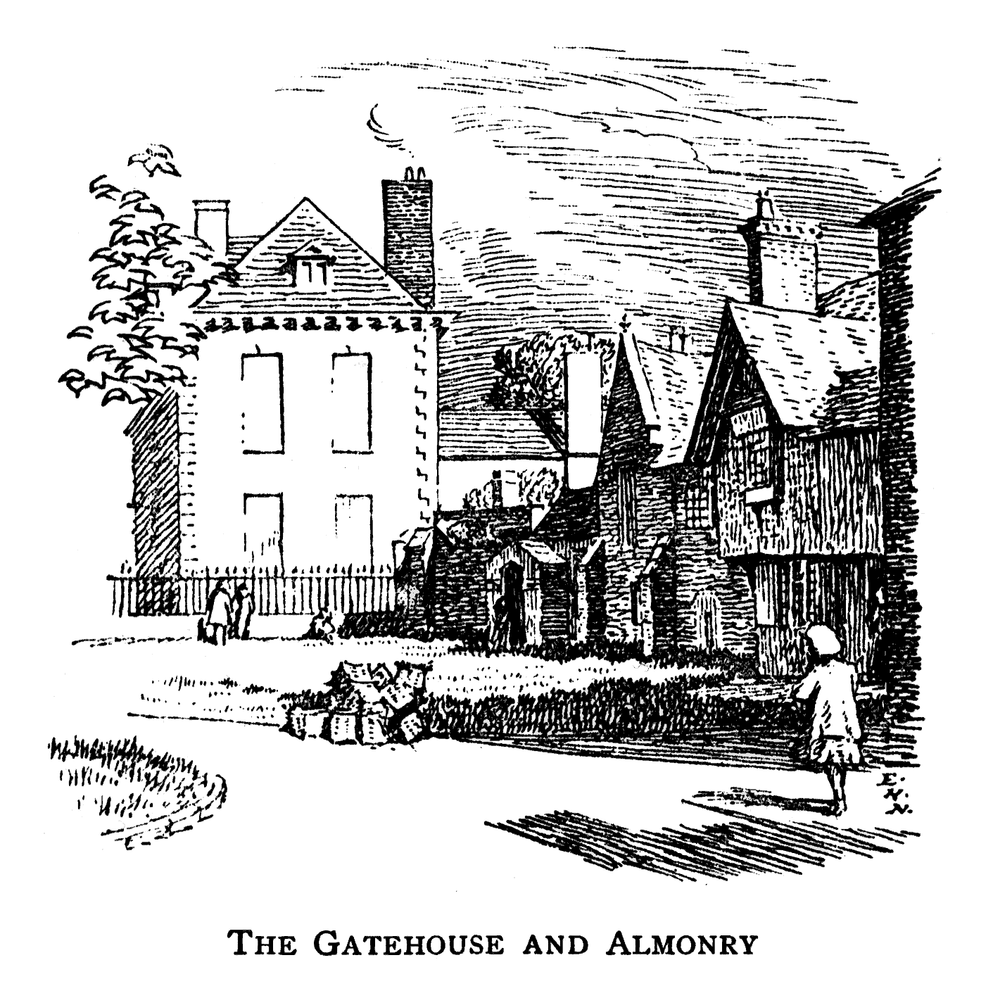 From time to time Abbots with a taste or genius for building added to the structure. In the thirteenth century the central tower fell, and this was in part rebuilt and the choir repaired by Marleberge, an Abbot conspicuous by his ability, of whom we shall hear later. It was Marleberge who helped to complete a bell tower, which also fell to the ground not many years after, to be replaced by the beautiful campanile which still remains. Although the great church of the Monastery was the principal part of that institution, and on it was lavished all the wealth and skill available, yet it was but a small part of the whole group of buildings forming the "mitred Abbey" of Saint Mary and Saint Egwin. Round the cloister were ranged the principal chambers accommodating the abbot and the monks. Here were the chapter house in which meetings of various kinds were held, the refectory where meals were served and partaken of, the long dormitory where the monks slept, and the scriptorium in which the writing and illuminating was done. Round the outer courtyard, entered by the great gatehouse, which could be defended in case of need, were other buildings, barns, stables, and servants' quarters. Not far away was the hospital, and almost adjoining the principal gatehouse was the Almonry where the poorer guests were received and food served out to the needy. This building exists at the present time, and it will be observed that it is not enclosed within the boundary wall but is open on one side to the public green.
