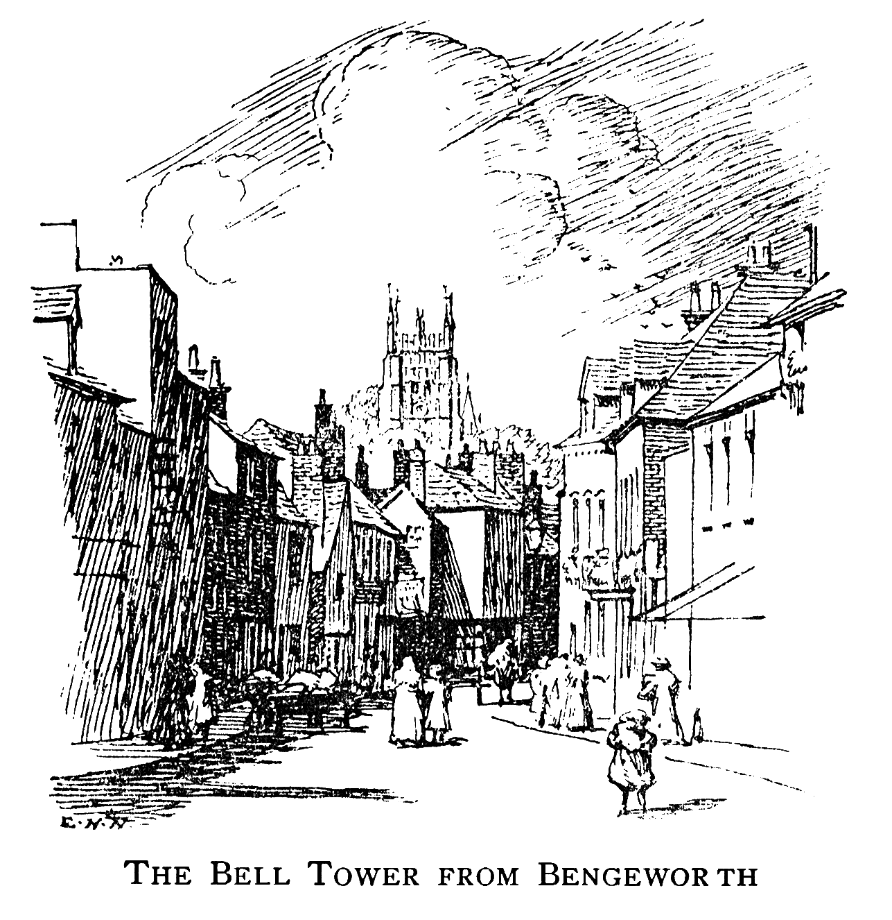 Alas! that modern enterprise and modern requirements should have demanded the removal of such a bridge as fifty years ago spanned the stream in eight irregular arches. Here we have convenience, but will this condone for the charm of picturesqueness and long association? We cannot but mourn over the loss. From the bridge we look up the river to the weir, mill and water-meadows. On the right, by the yard not far up the stream, stood, in the troublous reign of King Stephen a castle; and from this fortress William de Beauchamp sallied forth, forcibly entered the Abbey, and carried away the goods of the Church. But an abbot in those days was quite equal to meeting a hereditary sheriff on his own ground. Abbot William de Andeville descended on the castle, took it, razed it to the ground, and consecrated the site as a cemetery; no vestige of either castle or cemetery now remains. Old Bengeworth is hardly more than one long street, and there is little now to claim our attention. On the right side of the street, set back behind some iron railings, is a school founded early in the eighteenth century by John Deacle, a man of humble origin and a native of Bengeworth, who, moving to London became a wealthy woollen draper with a shop in Saint Paul's churchyard, and finally an Alderman of the City. In the new church is his tomb with an elaborate effigy in the costume of the period. Passing up the street we should turn before coming to the Talbot Inn and look back: from this point the irregular houses and roofs with the Bell Tower rising beyond make an attractive vignette. The old churchyard can be seen behind the Talbot Inn. The church is gone in favour of the modern and "handsome" structure which we saw before us as we turned out of the main street. Here are only the graves and the base of the old tower. Opposite the remains of the tower is an old stone house, once the manor, where a little chapel can still be seen in an upper room. Except the monument to John Deacle there is nothing in the new church to call forth our interest.