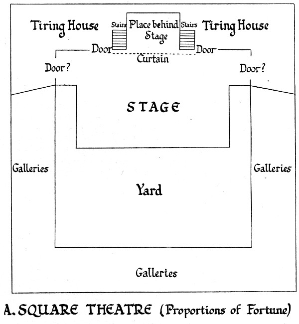 The three salient features of the Swan stage, as depicted by De Witt, are, firstly the two pairs of folding doors in the back wall; secondly, the ‘heavens’ supported on posts, which give the effect of a division of the space into a covered rear[73] and an uncovered front; and thirdly, the gallery or row of boxes, which occupies the upper part of the back wall. Each of these lends itself to a good deal of comment. The two doors find abundant confirmation from numerous stage-directions, which lead up to the favourite dramatic device of bringing in personages from different points to meet in the centre of the stage. The formula which agrees most closely with the drawing is that which directs entrance ‘at one door’ and ‘at the other door’, and is of very common use.[200] But there are a great many variants, which are used, as for example in the plot of 2 Seven Deadly Sins, with such indifference as to suggest that no variation of structure is necessarily involved.[201] Thus an equally common antithesis is that between ‘one door’ and, not ‘the other door’, but ‘an other door’.[202] Other analogous expressions are ‘one way’ and ‘at an other door’, ‘one way’ and ‘another way’, ‘at two sundry doors’, ‘at diverse doors’, ‘two ways’, ‘met by’;[203] or again, ‘at several doors’, ‘several ways’, ‘severally’.[204] There is a divergence, however, from De Witt’s indications, when we come upon terminology which suggests that more than two doors may have been available for entrances, a possibility with which the references to ‘one door’ and ‘an other’ are themselves not inconsistent. Thus in one of the 2 Seven Deadly Sins variants, after other personages have entered ‘seuerall waies’, we find ‘Gorboduk entreing in the midst between’. There are other examples of triple entrance in Fair Em, in Patient Grissell, and in The[74] Trial of Chivalry, although it is not until the seventeenth century that three doors are in so many words enumerated.[205] We get entrance ‘at every door’, however, in The Downfall of Robin Hood, and this, with other more disputable phrases, might perhaps be pressed into an argument that even three points of entrance did not exhaust the limits of practicability.[206] It should be added that, while doors are most commonly indicated as the avenue of entrance, this is not always the case. Sometimes personages are said to enter from one or other ‘end’, or ‘side’, or ‘part’ of the stage.[207] I take it that the three terms have the same meaning, and that the ‘end’ of a stage wider than its depth is what we should call its ‘side’. A few minor points about doors may be[75] noted, and the discussion of a difficulty may be deferred.[208] Some entrances were of considerable size; an animal could be ridden on and off.[209] There were practicable and fairly solid doors; in A Knack to Know an Honest Man, a door is taken off its hinges.[210] And as the doors give admittance indifferently to hall scenes and to out-of-door scenes, it is obvious that the term, as used in the stage-directions, often indicates a part of the theatrical structure rather than a feature properly belonging to a garden or woodland background.[211]