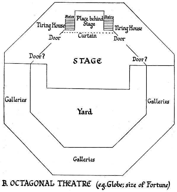 The threshold theory must not be pushed to a disregard of the clear evidence for a certain amount of interior action. We have already come across examples of shallow recesses, such as a tent, a cave, a bower, a tomb, a shop, a window, within which, or from within which, personages can speak. There are also scenes which must be supposed to take place within a room. In dealing with these, I propose to distinguish between spacious hall scenes and limited chamber scenes. Hall scenes are especially appropriate to palaces. Full value should no doubt be given to the extension in a palace of a porch to a portico, and to the convention, which kings as well as private men follow in Elizabethan plays, especially those located in Italian or Oriental surroundings, of transacting much important business more or less out-of-doors.[178] The characteristic Roman ‘senate house’, already described, is a case in point.[179] But some scenes must be in a closed presence-chamber.[180] Others are in a formal council room or parliament house. The conception of a hall, often with a numerous company, cannot therefore be altogether excluded. Nor are halls confined to palaces. They must be assumed for law courts.[181] There are scenes in such buildings as the[64] London Exchange, Leadenhall, the Regent House at Oxford.[182] There are scenes in churches or heathen temples and in monasteries.[183] There are certainly also hall scenes in castles or private houses, and it is sometimes a matter of taste whether you assume a hall scene or a threshold scene.[184] Certain features of hall scenes may be enumerated. Personages can go into, or come forth from, an inner room. They can be brought in from without.[185] Seats are available, and a chair or ‘state’ for a sovereign.[186] A law court has its ‘bar’. Banquets can be served.[187] Masks[65] may come dancing in.[188] Even a play ‘within a play’ can be presented; that of Bottom and his fellows in ‘the great chamber’ of Theseus’ palace is an example.[189]