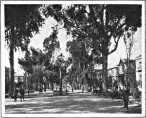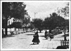 One of the most interesting parts of the city to visitors is the Alameda (ah-lah-may´-dah). This is a handsome thoroughfare, with rows of trees, shrubs and flowers. It also has a wide central walk with pools, in which are swans and goldfish. Along the Alameda are many new and rather pretty residences. Most of the houses are painted in tints of pale blue, green, yellow and strawberry, giving the street a gay and pleasing appearance.