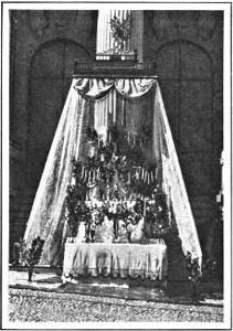 All the dignitaries of the church take part in the Corpus Christi day procession. Business is practically suspended, and the President of the Republic, accompanied by the members of the Houses of Congress and all the officials of the Government, march to the cathedral, where services are held. On various thoroughfares, altars are erected, and these are usually decorated by the members of the different ladies’ societies.