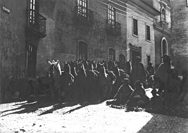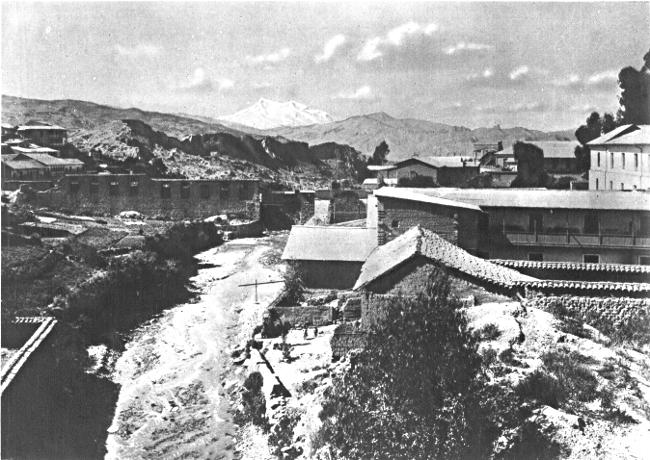 The greater part of La Paz lies on the left bank of the river. Both banks rise steeply from the stream, and the streets at right angles to the river are very precipitous. All the streets are narrow, and paved with small cobblestones. The sidewalks also are so narrow that only two may go abreast. Many of the inhabitants prefer to walk in the middle of the street. The only things likely to be met are either pedestrians or llamas, the latter used in great numbers in this part of the country as pack animals.