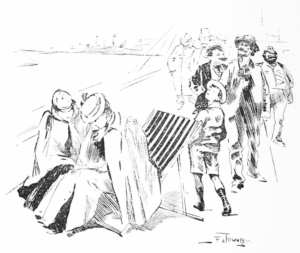 The first-class passengers maintained their attitude of suspicion as far as we were concerned; and when, after a period of discreet inoffensiveness, a sketch-book was called into requisition, they began to be quite sure that we were as objectionable as our clothing, and discussed us in groups, with such{51} lightning side-glances as only French eyes can give. For a little time an intermittent procession of men strolled in an elaborately casual manner round behind the sketch-book; but, finding themselves rewarded only by Arcadian glimpses of cattle, trees, and churches, they gradually settled down on their chairs again, and smoked the mysterious compound known to the French middle-classes as tobacco, while the cattle and the churches retired into the desert places of the sketch-book, and the page with the fat curé, his still fatter friend, and the insatiably curious little boy, came to light again.