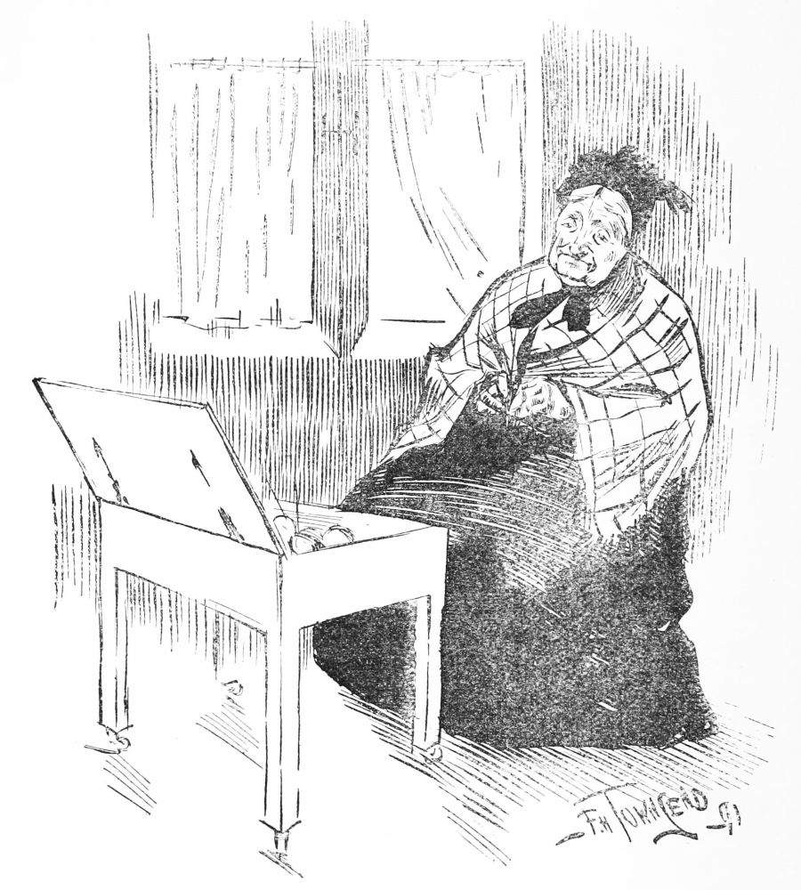 The shopwoman looked at her with compassion, and offered me a handsome long black lace veil, and with it the assurance that mademoiselle would find it very becoming. At this stage in the negotiation the two purchasers began to laugh with the agonising laughter that has too often overtaken them in shops, and the shopwoman, as is usual in such cases, was obviously convinced that she was being laughed at, and haughtily replaced the lace veil in its box. Having wept profusely and idiotically before her for some moments, we recovered sufficiently to ask for white muslin, and succeeded in buying a suitable piece, with which we slunk out of the shop, resolved that in future death alone should part us from Bellows’ Dictionary.{27}