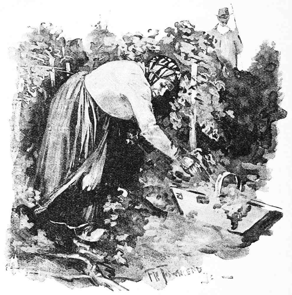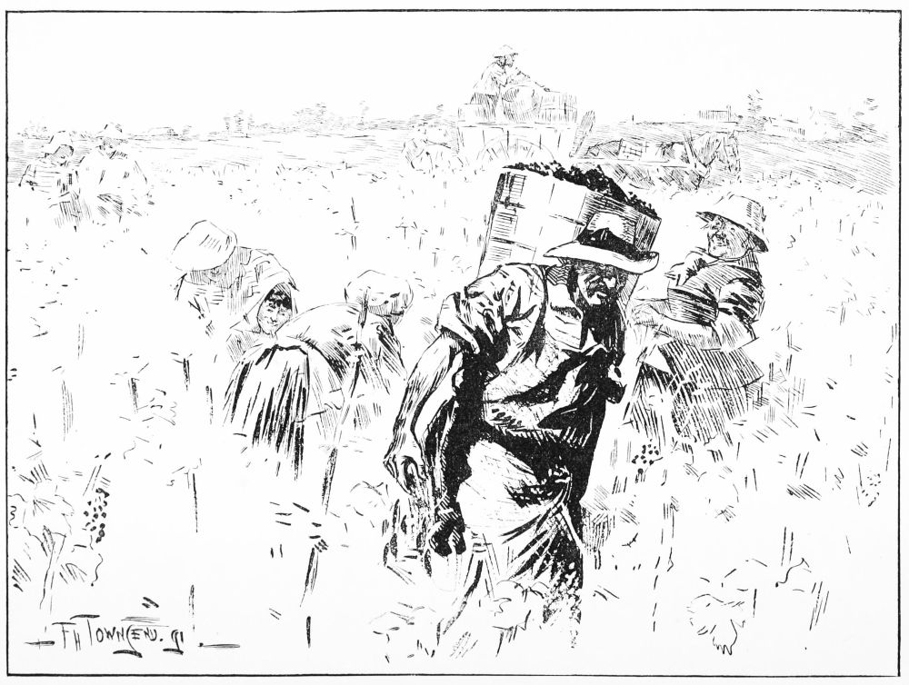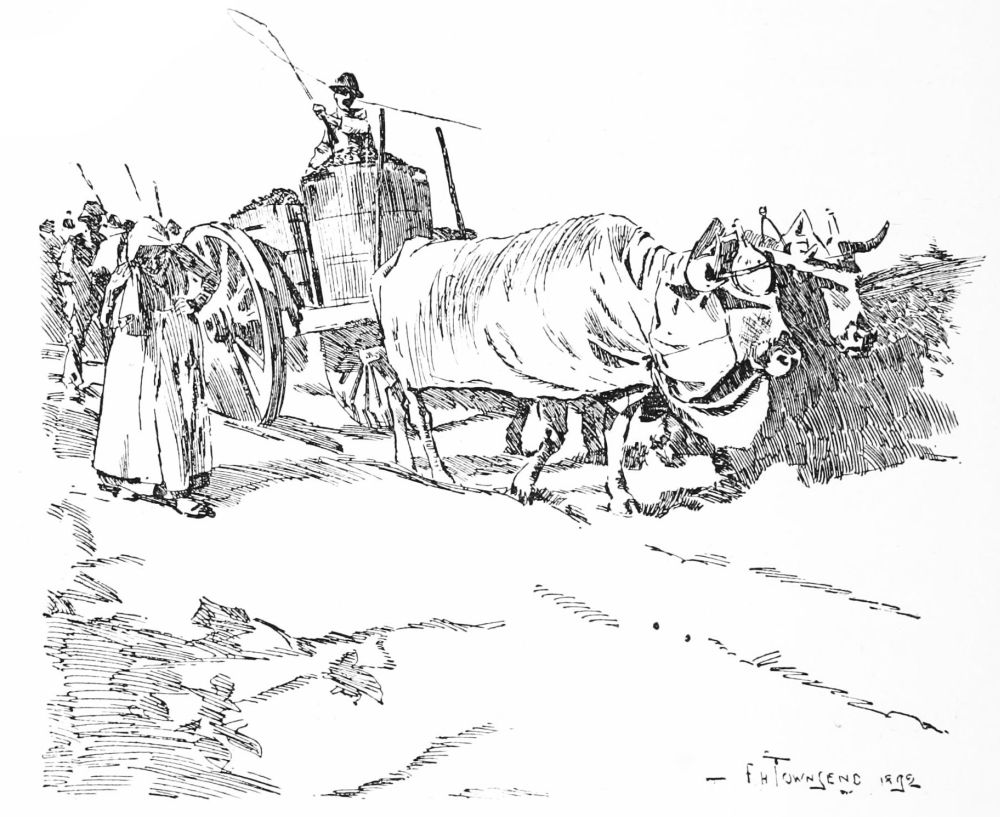 The few days that we spent there with Monsieur and Madame A. were like no other part of our lives, and retained to the last the ease and enjoyment and the pervading sense of welcome that came so soothingly to us that first afternoon. English management and comforts were not made incongruous by the aromatic flavour of French surroundings and the vivid pageant of the vintage; each accented the other, and retired into the background with unfailing fitness. It was near the end of the vintage when we arrived. The handsome red and white buildings{203} which held the cuvier, the long line of stables and farm-buildings, the immense storehouses full of wine and wine barrels, were at their busiest, and on the slopes below the château the vintagers were working at top speed to finish by the end of the week. As we walked through the long vineyards by the river, the grapeless rows of vines looked forlorn and elderly, like mothers who have married off their daughters and have no occupation left. It was far more inspiriting to move farther on, and watch the sight that was now so familiar and yet always so fresh, the women’s figures moving waist-high in the green,—the men carrying the heavy hottes of fruit on their necks, the overseer with his eight-foot pole pointing fatefully to the bunch of grapes left behind by the careless vendangeuses, the hurry and bustle of everything, and the creamy oxen stepping slowly and imperturbably through it all, with their seventeen hands of height shrouded in grey draperies to preserve them from the flies, sentient apparently of nothing except the driver’s voice and the guiding{204}