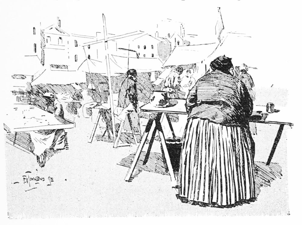 We carried a map of Bordeaux in our hands, and stopped many times to study it as we strolled along, causing thereby an ecstasy of interest among the sailors and the women sitting at their stalls of strange fruits and fungi. It was disappointing that French wit did not on these occasions elaborate any jest more sparkling than ‘Ah! Les Anglaises!’ though the inhabitants seemed to find the humour of the situation satiatingly expressed in this simple{39} formula. Once, in Paris, a butcher’s boy screamed ‘Angleesh spock-en’ after us, and convulsed the whole street with the sally; but we thought that we could have produced something better any day on Patrick’s Bridge, Cork. We perseveringly ciphered out our route to the church of St. Michel, assisted a good deal, it must be admitted, by the fact that its steeple is the tallest thing in Bordeaux. We were getting very hot indeed as we toiled through the Tour de Cailhau—so hot that, as a Galway woman once remarked, ‘it would have been a pleasure to any one to lie down and die,’ and we longed to sit down and rest on the kerbstone in the shade of the Tour beside a man in a blue blouse who was sharpening a razor in his entirely filthy palm.
