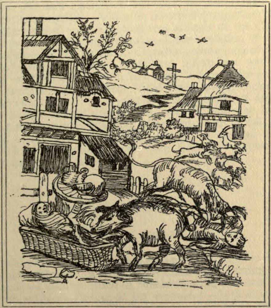 In 1386, an infanticidal sow was executed in the old Norman city of Falaise, and the scene was represented in fresco on the west wall of the Church of the Holy Trinity in that city. This curious painting no longer exists, and, so far as can be ascertained, has never been engraved. It has been frequently and quite fully described by different writers, and the frontispiece of the present volume is not a reproduction of the original picture, but a reconstruction of it according to these descriptions. It is taken from Arthur Mangin’s L’Homme et la Bête (Paris, 1872), of which all the illustrations are more or less fancy sketches. A full account of the trial and execution is given in the present volume.