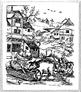 [3] These animals are spoken of as unvernünftige Thierlein genannt Lutmäuse. Lut might be derived from the Old German lût (Laut, Schrei), in which case Lutmaus would mean shrew-mouse; but it is more probably from lutum (loam, mould), and signifies mole or field-mouse. Field-mice are exceedingly prolific rodents, and in modern as well as in mediæval times have often done grievous harm to husbandry and arboriculture by consuming roots and fruits and gnawing the bark of young trees. The recklessness of hunters in exterminating foxes, hedgehogs, polecats, weasels, buzzards, crows, kites, owls and similar beasts and birds, which are destructive of field-mice, has frequently caused the latter to multiply so as to become a terrible plague. This was the case in England in 1813-14, and in Germany in 1822, and again in 1856.