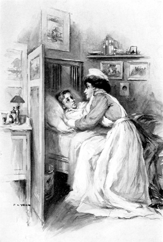 His thin arms locked round the neck of the young nurse.