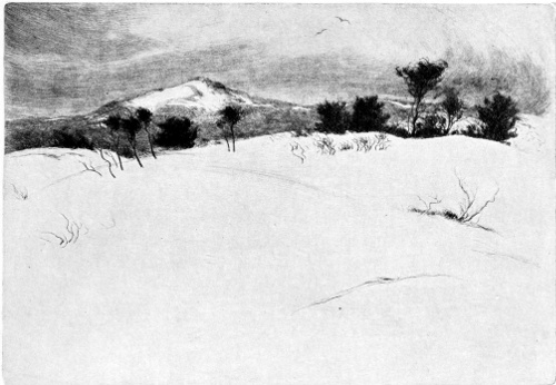 The Country of the Dunes had come into being. Somewhere deep in its bosom shines the Dream Jewel. Like “The Great Carbuncle,” its fervid splendor beams from a fount unknown. Its iridescence flashes from the distant dunes at sunset. It is in the twilight afterglows, on the sapphire waters of the lake on summer days, and in the fairylands that are pictured in the pools. It glorifies dull winter landscapes with skies of infinite hues, and glances from twisted trunks of ancient pines on hills that defy the storms. It pulsates in star reflections that haunt the margins of wet 22 sands, and where crescent moons touch the waves that toss on night horizons. Its tinge is in the tender leaves and petals of the springtime, and in the flush of autumn’s robes. We see its elusive tints through vistas in the dusk, and in the purple mystery that fills the shadowy places, for the Dream Jewel is Beauty, and they who know not its holy light must walk in darkness. 23