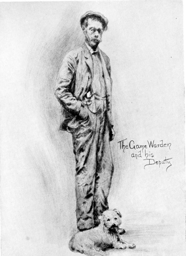 Erskine Douglas Potts, the game warden, was a lengthy loose-jointed individual. One eye drooped in a peculiar way, and seemed to rove independently of the other. Sipes declared that “Doug’ c’n look up in a tree with one eye, an’ down a hole with the other lamp at the same time.” Odd humor radiated from him and he had a deep sense of his dignity as an upholder of the “revised stat-toots.” Two printed copies of the state game laws protruded from the top of his trousers, where they were secured by a safety pin. “Casey,” his small yellow dog, was his inseparable companion. They were a devoted pair of chums and Potts refused to allow a “pitcher” to be made of him unless the dog was included.