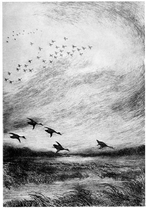 There were great stretches of marshy wastes and flooded lowlands, where millions upon millions of water fowl found welcome retreats and never failing food. During the migrating seasons in the spring and fall, vast flocks of ducks were patterned against the clouds. They swooped down in endless hordes. Turbulent calls and loud trumpetings heralded the coming of serried legions of geese, 18swans and brant, as they broke their ranks, settled on to the hospitable waters and floated in gentle contentment.