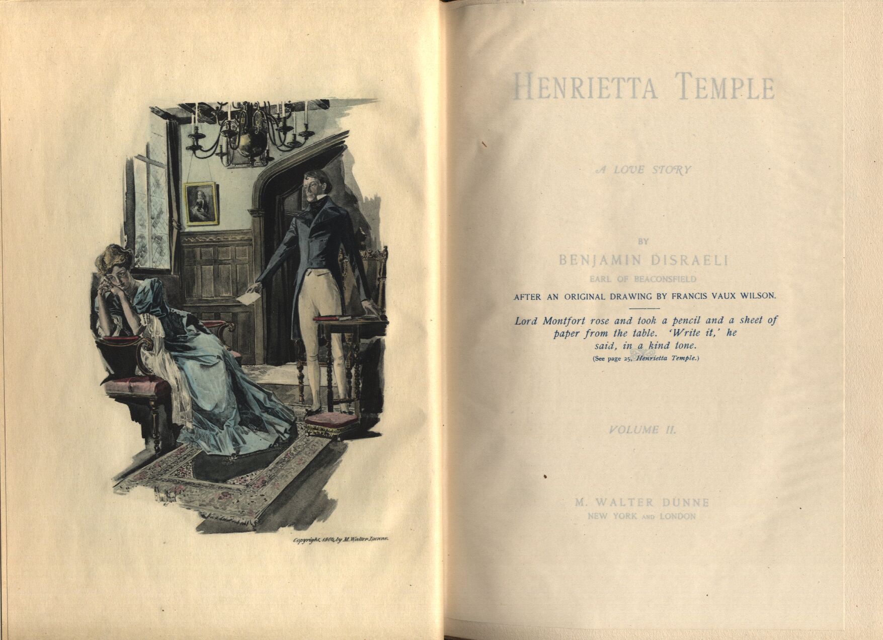 In the daily increasing happiness of his beloved daughter, Mr. Temple has quite forgotten any little disappointment which he might once have felt at not having a duke for a son-in-law, and such a duke as his valued friend, Lord Montfort. But Ferdinand Armine is blessed with so sweet a temper that it is impossible to live with him and not love him; and the most cordial intimacy and confidence subsist between the father of Henrietta Temple and his son-in-law. From the aspect of public affairs also, Mr. Temple, though he keeps this thought to himself, is inclined to believe that a coronet may yet grace the brow of his daughter, and that the barony of Armine may be revived. Soon after the passing of the memorable Act of 1828, Lord Montfort became the representative of his native county, and an active and influential member of the House of Commons. After the reform, Mr. Armine was also returned for a borough situate near the duke’s principal seat, and although Lord Montfort and Mr. Armine both adhere to the Whig politics of their families, they have both also, in the most marked manner, abstained from voting on the appropriation clause; and there is little doubt that they will ultimately support that British and national administration which Providence has doubtless in store for these outraged and distracted realms. At least this is Mr. Temple’s more than hope, who is also in the House, and acts entirely with Lord Stanley. The Montforts and the younger Armines contrive, through mutual visits and a town residence during the Session, to pass the greater part of their lives together; they both honestly confess that they are a little in love with each other’s wives, but this only makes their society more agreeable. The family circle at Armine has been considerably increased of late; there is a handsome young Armine who has been christened Glastonbury, a circumstance which repays the tenant of the tower for all his devotion, and this blending of his name and memory with the illustrious race that has so long occupied his thoughts and hopes, is to him a source of constant self-congratulation. The future Sir Glastonbury has also two younger brothers quite worthy of the blood, Temple and Digby; and the most charming sister in the world, with large violet eyes and long dark lashes, who is still in arms, and who bears the hallowed name of Henrietta. And thus ends our LOVE STORY.