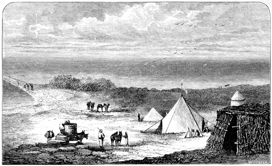 Dec. 31.—We had all four settled the evening before to go out shooting, and accordingly, this morning, we started early for the lowest range of hills to be seen in the distance. We expected to find some small game, such as gazelles and small deer. I rode a camel, and H. a donkey. Traversing the narrow causeway which joined the little peninsula on which our camp was situate to the mainland, the first thing that struck me was the beautiful colours of the fish in the seawater at each side of the causeway. A. got off his camel and tried to shoot one, but the water was rather deep.