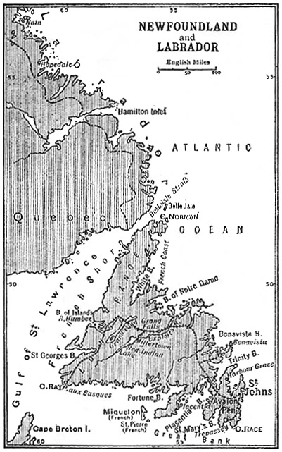 To understand that story a short account must be given at the outset of the situation and character of the island. But for the north-eastern side of the country, which is indented by deep and wide inlets, its shape might be roughly described as that of an equilateral triangle. Its area is nearly 43,000 square miles, so that it is larger than Scotland and considerably greater than Ireland, the area of which is 31,760 square miles. Compared to some of the smaller states of Europe, it is found to be [9]twice as large as Denmark, and three times as large as Holland. There is only a mile difference between its greatest length, which from Cape Ray, the south-west point, to Cape Norman, the northern point, is 317 miles, and its greatest breadth, from west to east, 316 miles from Cape Spear to Cape Anguille. Its dependency, Labrador, an undefined strip of maritime territory, extends from Cape Chidley, where the Hudson's Straits begin in the north, to Blanc Sablon in the south, and includes the most easterly point of the mainland. The boundaries between Quebec and Labrador have been a matter of keen dispute. The inhabitants are for the most part Eskimos, engaged in fishing and hunting. There are no towns, but there are a few Moravian mission stations.