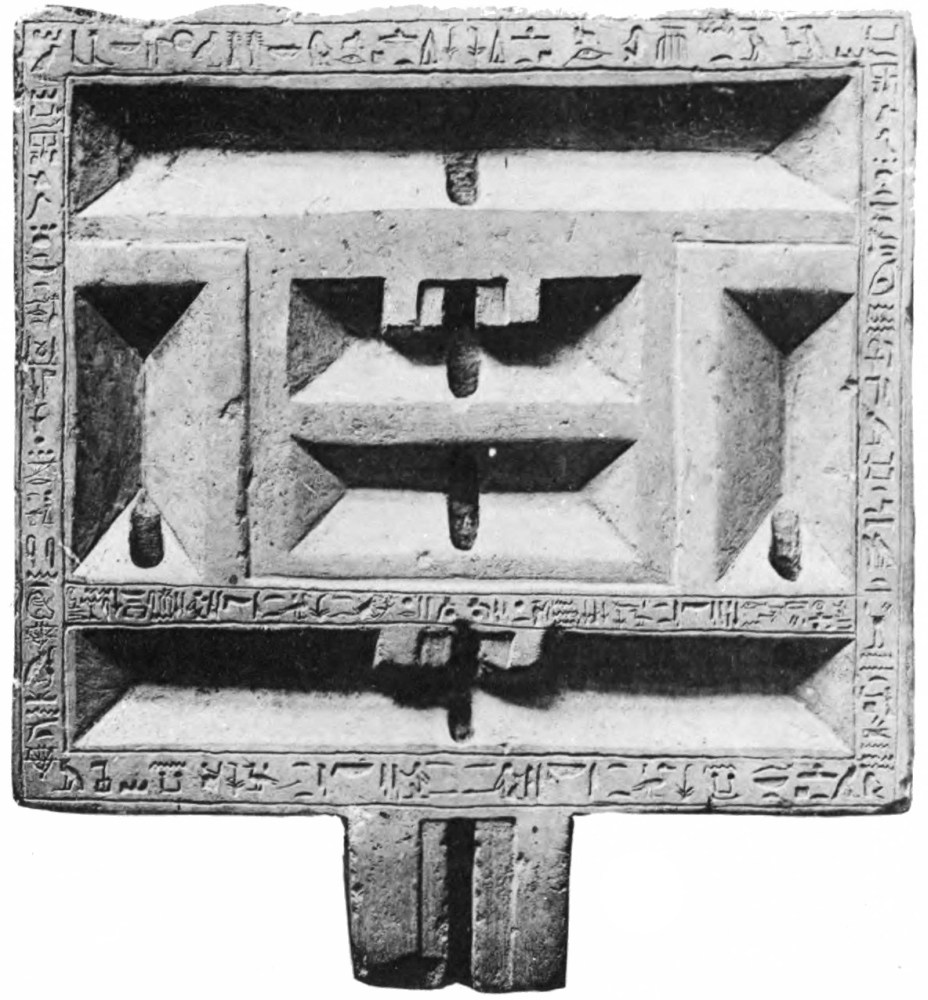 [44] Annales, 1903, Tome IV, p. 70. A coffin of a certain Heq-Tau. ‘The bottom of the coffin is divided into small compartments by a kind of wooden frame or trellis, each division being filled with earth, probably representing cultivated land.’