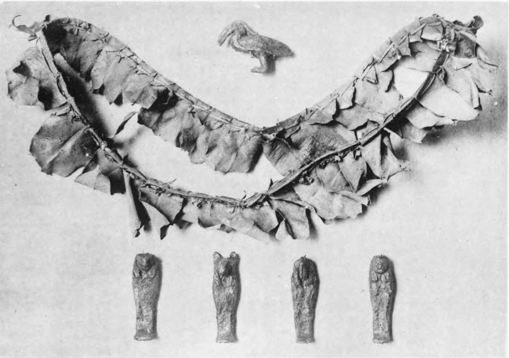 [33] See Tomb 24, Pl. XLVI, Fig. 2 G, and amulet necklace of Vth Dynasty, Petrie, Deshasheh, Pl. XLVI. This type of necklace seems almost a necessary adjunct to the dead in the earlier periods.