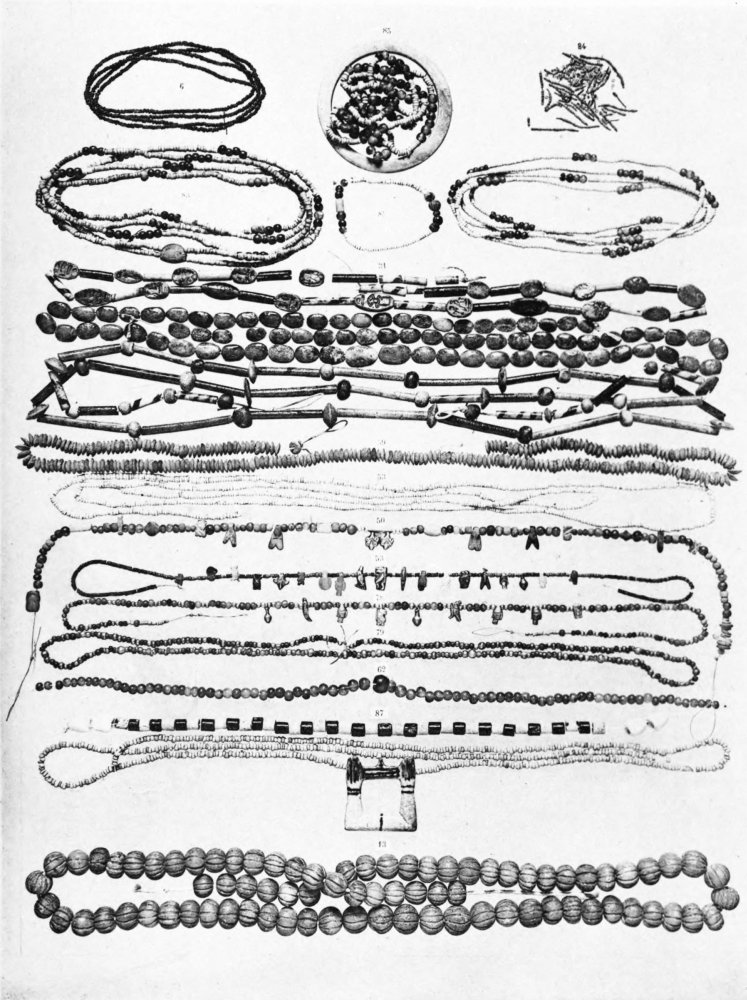 [50] The three examples given in this illustration are the types found among the many necklaces belonging to the basket that was found lying in the coffin.