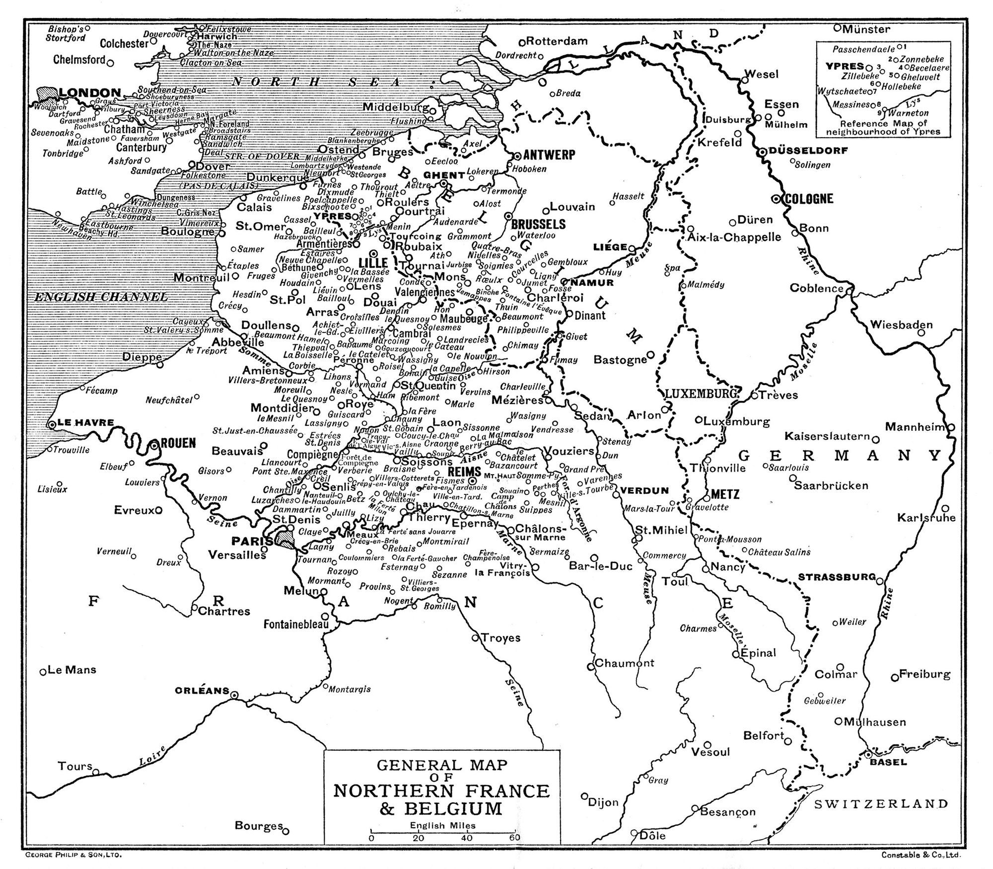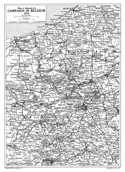 Mais déjà l'Armée Belge, appuyée de troupes françaises, arrête les allemands sur l'Yser, de Nieuport à Dixmude. Après avoir pris part aux actions de l'Aisne, l'Armée Britannique a été transportée dans le Nord. C'est ainsi qu'elle s'engage (p. xii) progressivement de La Bassée à Ypres, s'opposant partout à l'invasion.
