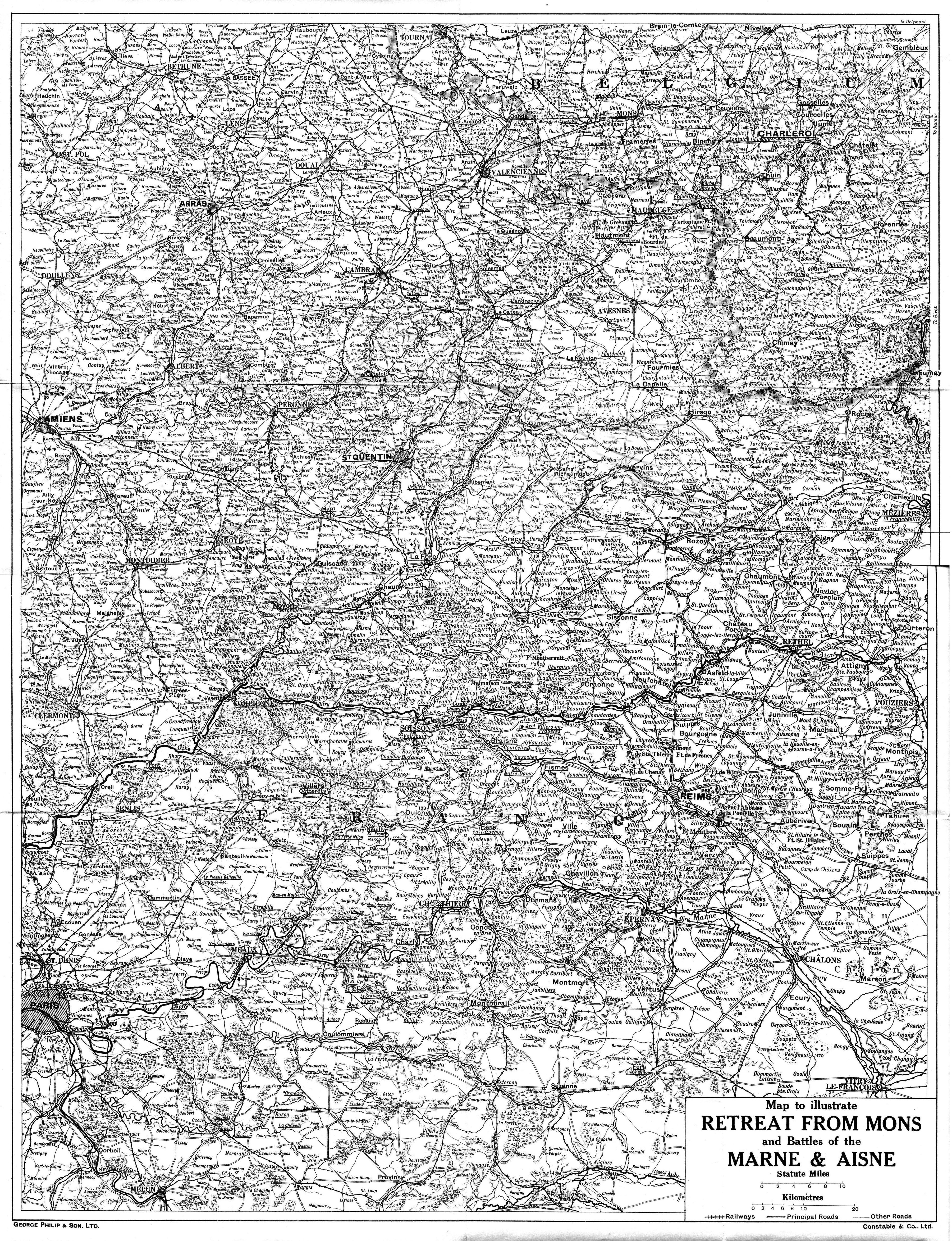 The British and French General Staffs had for some years been in close secret consultation with one another on this subject. The German menace necessitated some preliminary understanding in the event of a sudden attack. The area of concentration for the British Forces had been fixed on the left flank of the French, and the actual detraining stations of the various units were all laid down in terrain lying between Maubeuge and Le Cateau. The Headquarters of the Army were fixed at the latter place.