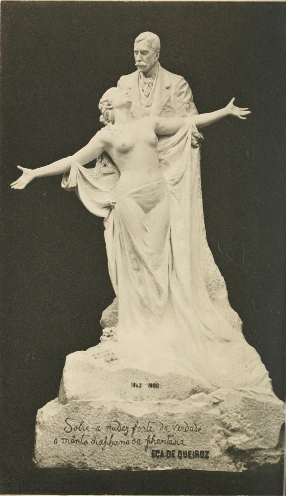 The frontispiece of the present volume shows the monument in the Largo do Quintella in Lisbon raised to Queiroz by the devotion of the Conde de Arnoso and other admiring friends. The bust is generally agreed to be an excellent likeness, though the face perhaps wears a severer expression in marble than it did in life, and it has not therefore the photographic accuracy of the bust by Raphael Bordallo Pinheiro, a replica of which{x} faces me as I write. The woman symbolises Reality, and her attitude shows her revealing the secrets of life to Eça’s scrutinising gaze, while the inscription at the base sums up his ideal and achievement, and reads: 'Over the forceful nakedness of truth, the diaphonous mantle of fantasy.’ The monument is the work of Senhor Antonio Teixeira Lopes, the creator of those two masterpieces, the bronze figure of History[1] erected in memory of the historian Oliveira Martins in the Prazeres Cemetery in Lisbon, and the statue in wood of St. Isabel in the Church of Santa Clara at Coimbra.