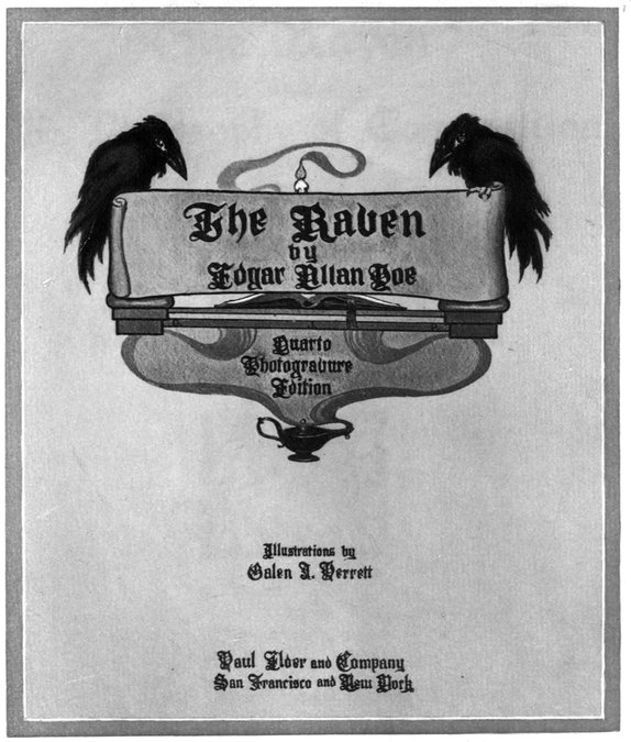 Here ends The Raven, a poem, and The Philosophy of Composition, a prose essay; the poem and the essay by Edgar Allan Poe, the photogravure illustrations from paintings by Galen J. Perrett, the initials and decorations by Will Jenkins, the typography designed by J. H. Nash. Of this first Quarto Photogravure Edition one thousand copies have been issued, printed on Arches handmade paper. Published by Paul Elder and Company and done into a book for them at the Tomoye Press, New York City. Finished this Tenth Day of July, in the year Nineteen Hundred and Seven.