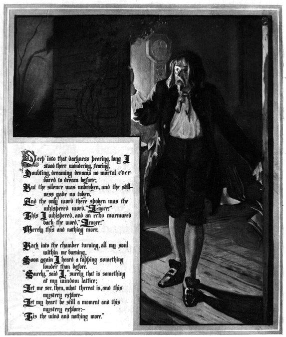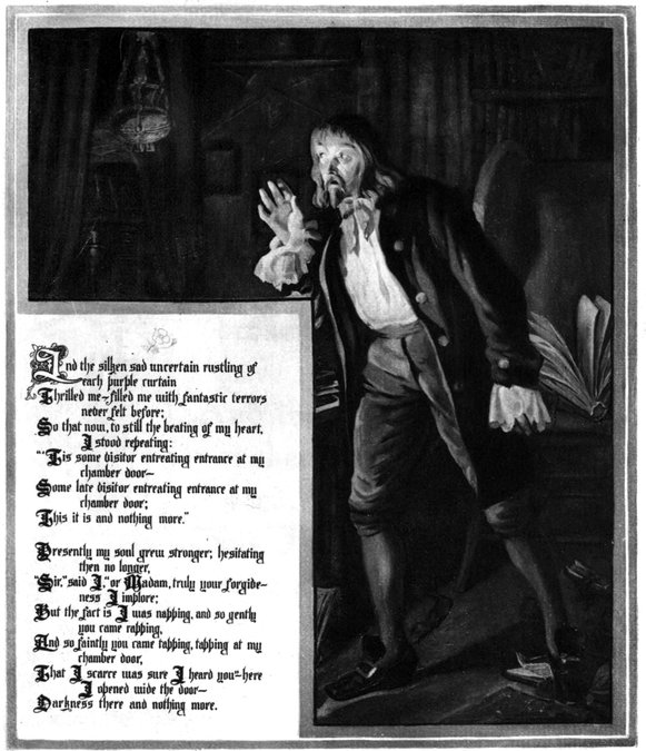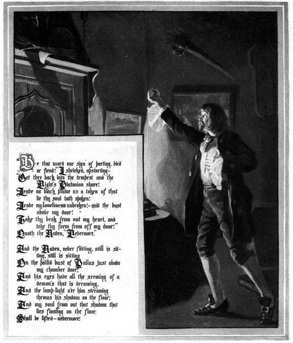 The locale being thus determined, I had now to introduce the bird—and the thought of introducing him through the window was inevitable. The idea of making the lover suppose, in the first instance, that the flapping of the wings of the bird against the shutter is a “tapping” at the door, originated in a wish to increase, by prolonging, the reader’s curiosity, and in a desire to admit the incidental effect arising from the lover’s throwing open the door, finding all dark, and thence adopting the half-fancy that it was the spirit of his mistress that knocked.