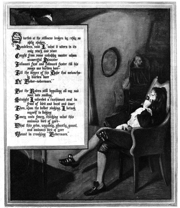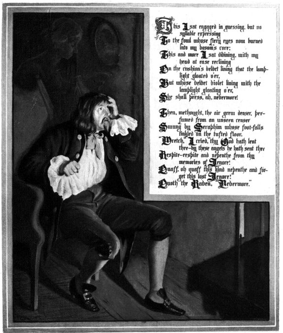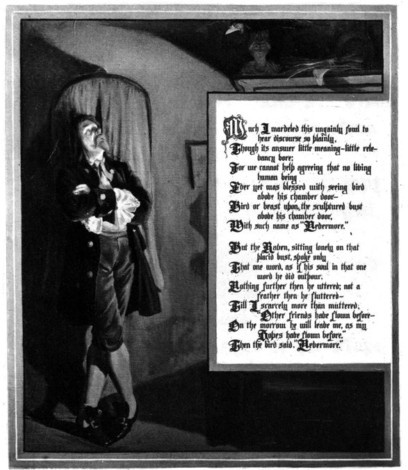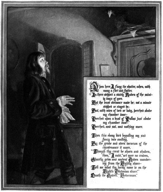 I had now gone so far as the conception of a Raven—the bird of ill omen—monotonously repeating the one word, “Nevermore,” at the conclusion of each stanza, in a poem of melancholy tone, and in length about one hundred lines. Now, never losing sight of the object supremeness, or perfection, at all points, I asked myself—“Of all melancholy topics, what, according to the universal understanding of mankind, is the most melancholy?” Death—was the obvious reply. “And when,” I said, “is this most melancholy of topics most poetical?” From what I have already explained at some length, the answer, here also, is obvious—“When it most closely allies itself to Beauty: the death, then, of a beautiful woman is, unquestionably, the most poetical topic in the world—and equally is it beyond doubt that the lips best suited for such topic are those of a bereaved lover.”