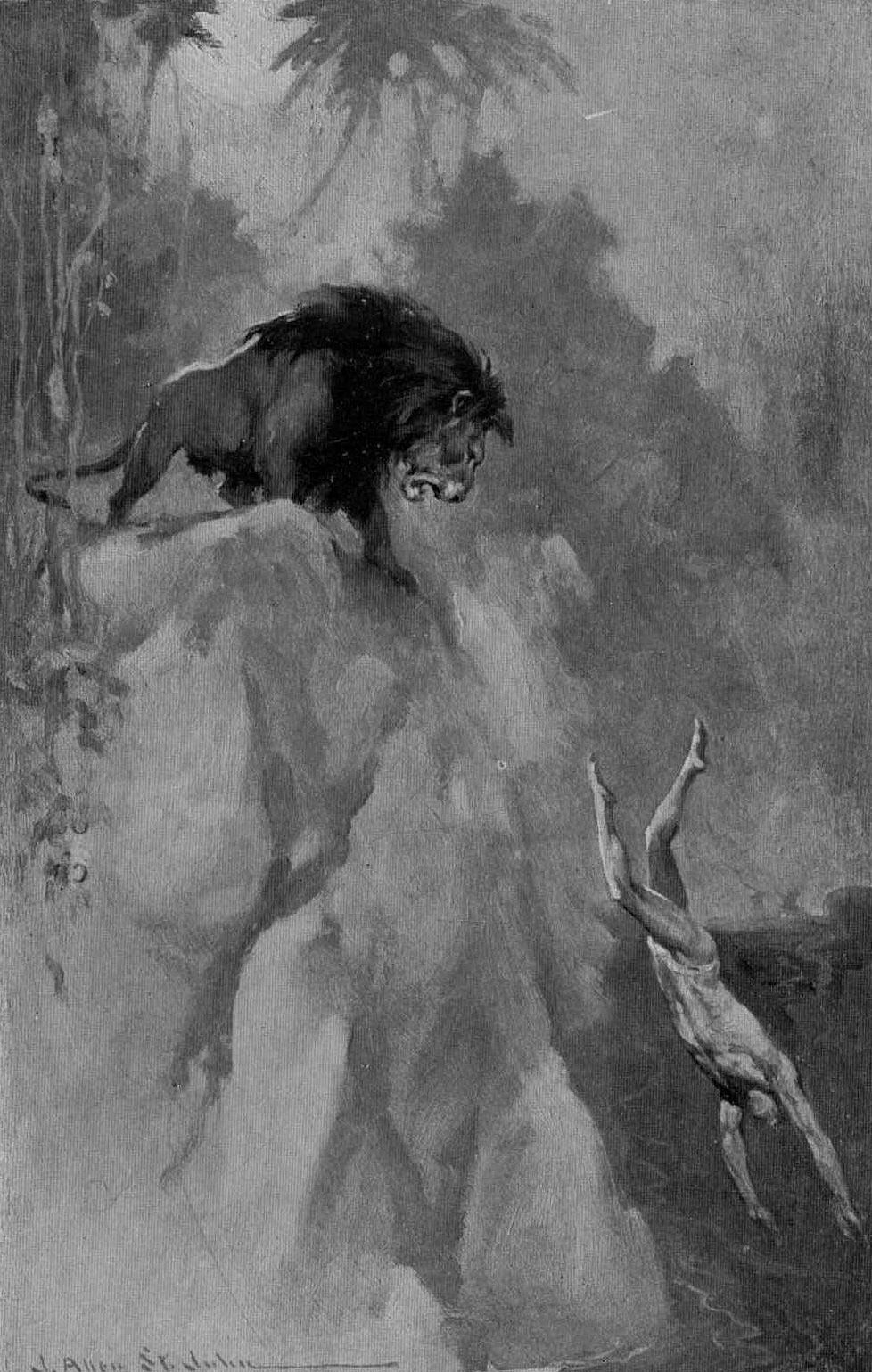 “Down!” commanded the ape-man. “Lie down, Jad-bal-ja!” His voice was low and firm. The lion hesitated but for an instant, and then lay down as Tarzan of the Apes had taught him to do at the word of command. Tarzan turned and lifted the carcass of the antelope to his shoulder.