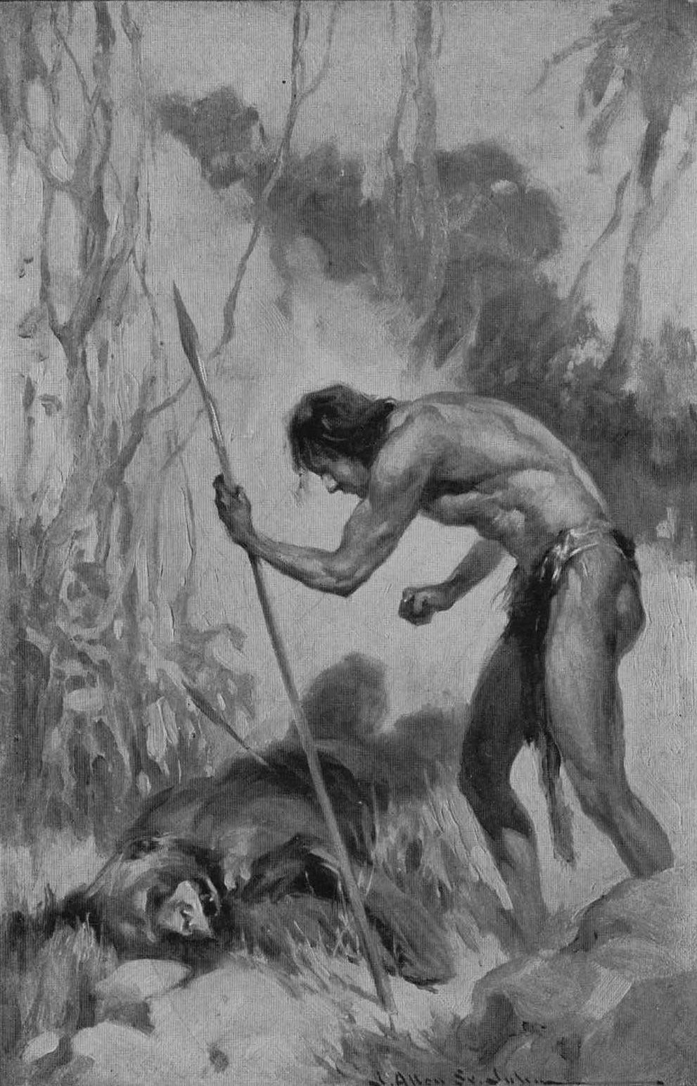 SABOR, the lioness, suckled her young—a single fuzzy ball, spotted like Sheeta, the leopard. She lay in the warm sunshine before the rocky cavern that was her lair, stretched out upon her side with half closed eyes, yet Sabor was alert. There had been three of these little, fuzzy balls at first—two daughters and a son—and Sabor and Numa, their sire, had been proud of them; proud and happy. But kills had not been plentiful, and Sabor, undernourished, had been unable to produce sufficient milk to nourish properly three lusty cubs, and then a cold rain had come, and the little ones had sickened. Only the strongest survived—the two daughters had died. Sabor had mourned, pacing to and fro beside the pitiful bits of bedraggled fur, whining and moaning. Now and again she would nose them with her muzzle as though she would awaken them from the long sleep that knows no waking. At last, however, she abandoned her efforts, and now her whole savage heart was filled with concern for the little male cub that remained to her. That was why Sabor was more alert than usual.