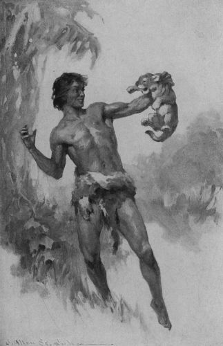 It was thus that Tarzan found him—Tarzan and Jane, his wife, and their son, Korak the Killer, returning from the mysterious land of Pal-ul-don from which the two men had rescued Jane Clayton. At the sound of their approach the cub opened his eyes and rising, flattened his ears and snarled at them, backing close against his dead mother. At sight of him the ape-man smiled.