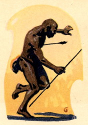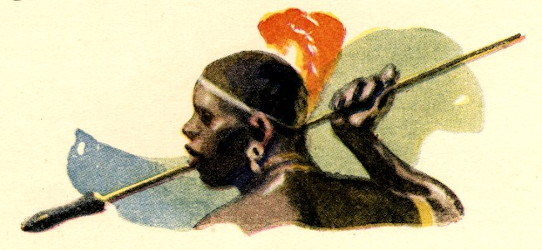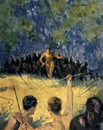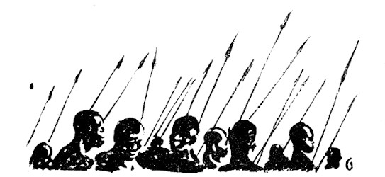 Doc fitted an arrow to his bow and shot it at the oncoming warriors, but, sped by an unaccustomed hand, the arrow only described a graceful curve and stuck upright in the ground a few yards from Doc's feet. The Bagalla shouted in derision and rushed forward. Then Dick shot, but the string slipped from the notch in the end of the arrow an when he released the missile, it fell at his feet. But Ukundo was more adept. He drew the shaft far back, and when he let it fly, it embedded itself deeply in the breast of a shouting Bagalla. Then the Bagalla halted.