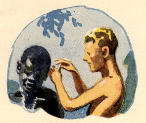 The twins and Ukundo had not long to wait before Paabu returned, as he had promised, bringing weapons to them. His terror was quite real when he received Doc's pocket knife in payment of his services, but his ambition to become a great witch-doctor overcame his fears and it was a proud, though frightened Paabu, who sneaked away in the darkness, clutching the big medicine tightly in one grimy paw.