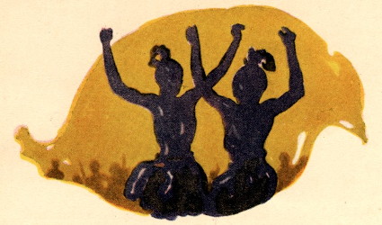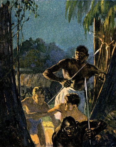 There they stood, shouting threats and insults at the four fugitives who stumbled along the crooked jungle trail. But words could neither harm them, nor bring them back, and presently Galla Galla led his people back into the village and closed the gates.