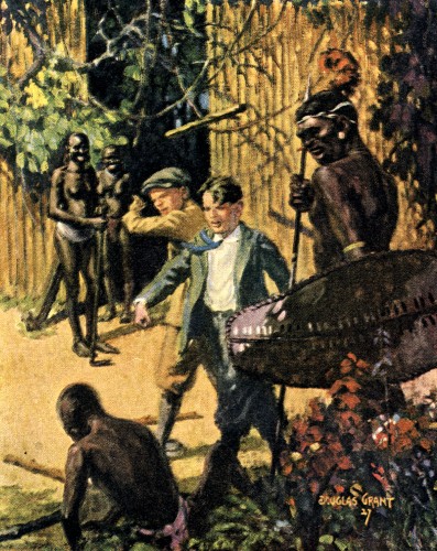 Here they met their serious obstacle. The gates were secured by chains through which was fastened an old time padlock, such as slavers once used to secure the chains to the necks of their poor victims. For a moment it seemed that they were doomed to failure at the very outset of their attempted break for liberty, but as the boys were examining the fastenings, Doc almost gave vent to a cry of relief; he had discovered that, with true native shiftlessness, the Bagalla had fastened the end of one of the stout chains to a post of the palisade with a bit of grass rope and as a chain is no stronger than its weakest link, this proved a very weak chain indeed. A single stroke of Doc's knife severed the rope and the chain clattered to the ground—an occurrence that almost proved their undoing for the noise startled a nearby cur into a frenzy of barking that was quickly taken up by every other dog in the village until it seemed that a thousand dogs were yapping at the top of their lungs.