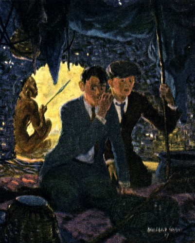 Ukundo told them that Intamo was making medicine to frighten the demons away from the pots in which Bulala would be cooked on the morrow and that the real festivities would not commence until the following night. There was little dancing in the village, that night, and after Intamo had completed his ceremony, the blacks commenced to retire to their huts and soon the village street was deserted. All the fires were banked with the exception of one. The village was quite dark.